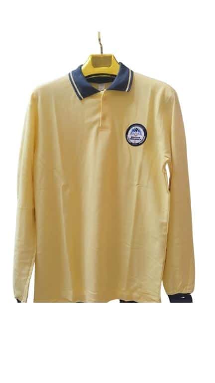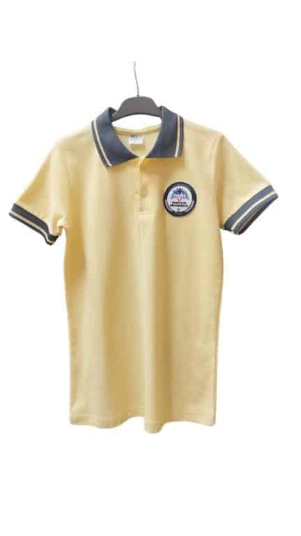 Üst: Yaka ve kollarda gri üzerine sarı çizgileri olan sarı renkli T-shirt